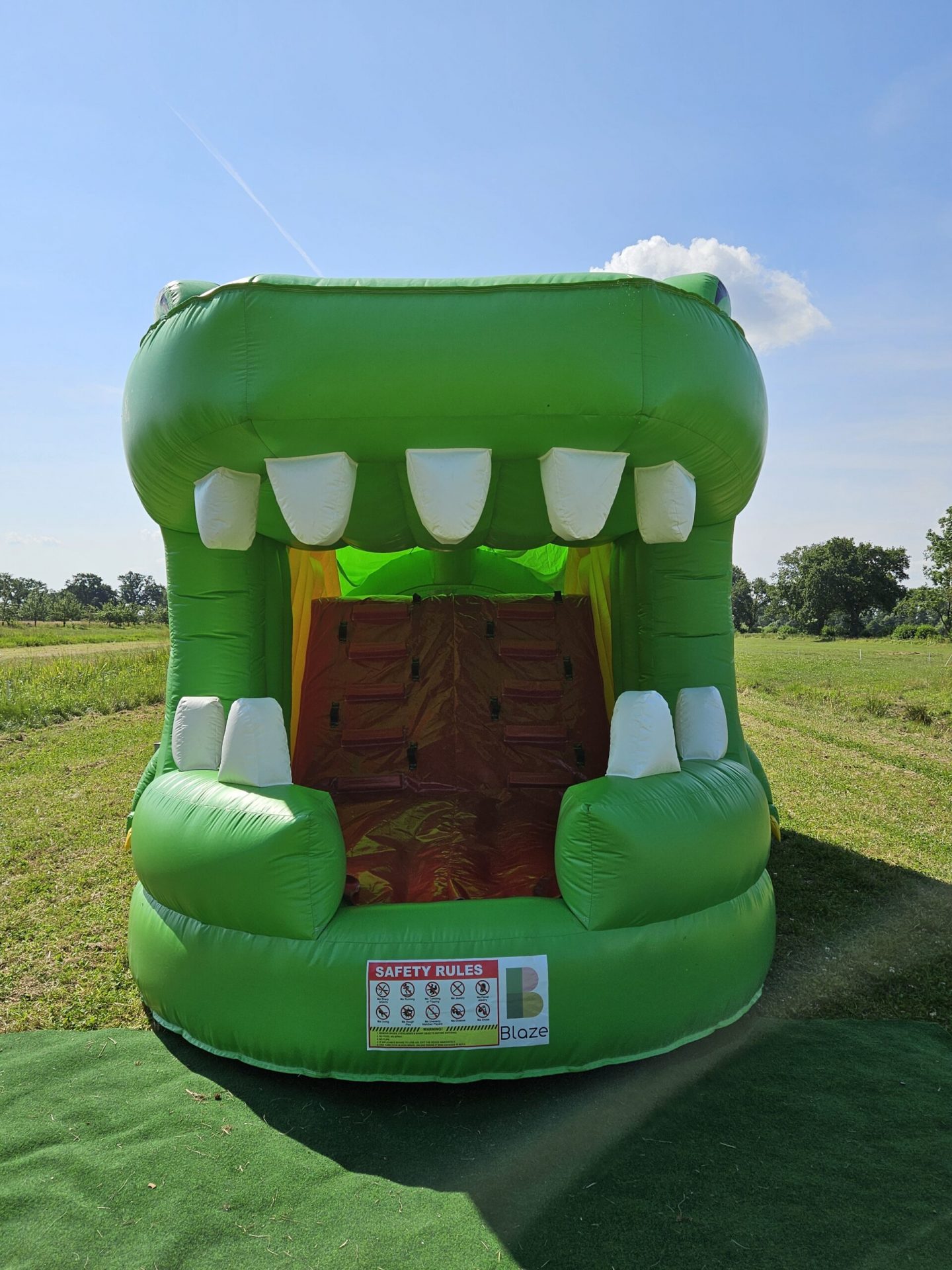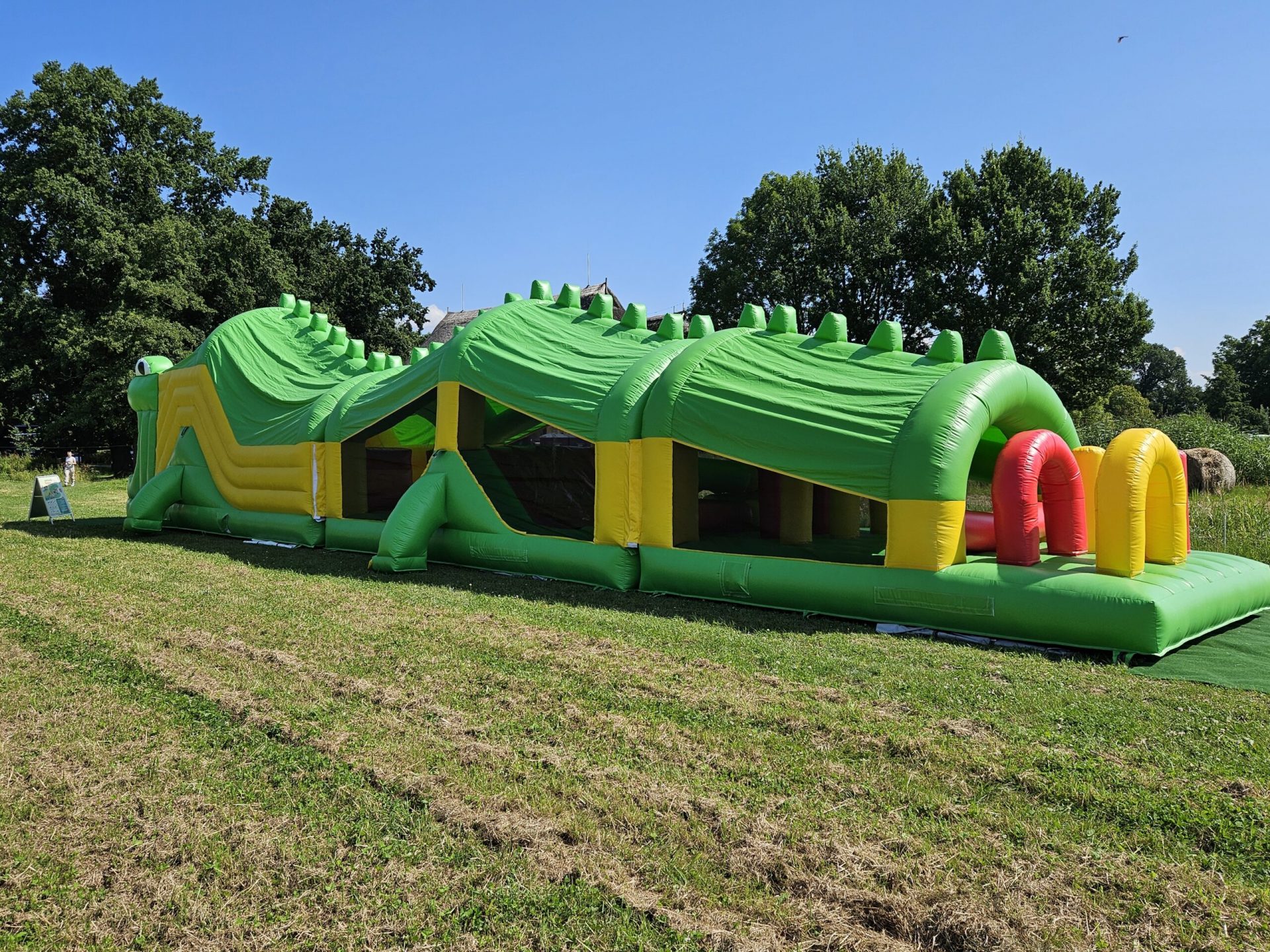 Die Hüpfburg XXL "Kroko" besticht durch ihr farbenfrohes und detailreiches Design. Mit ihrer großzügigen Fläche bietet sie viel Platz zum Springen, Klettern und Toben.