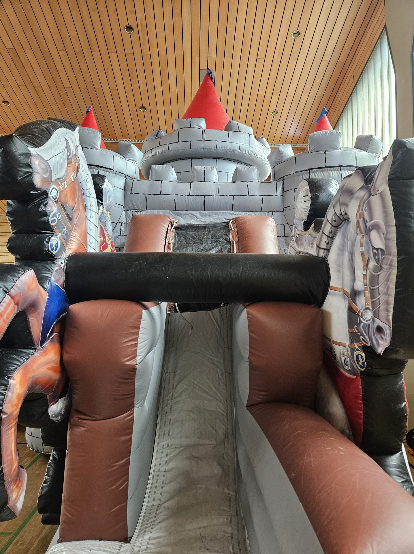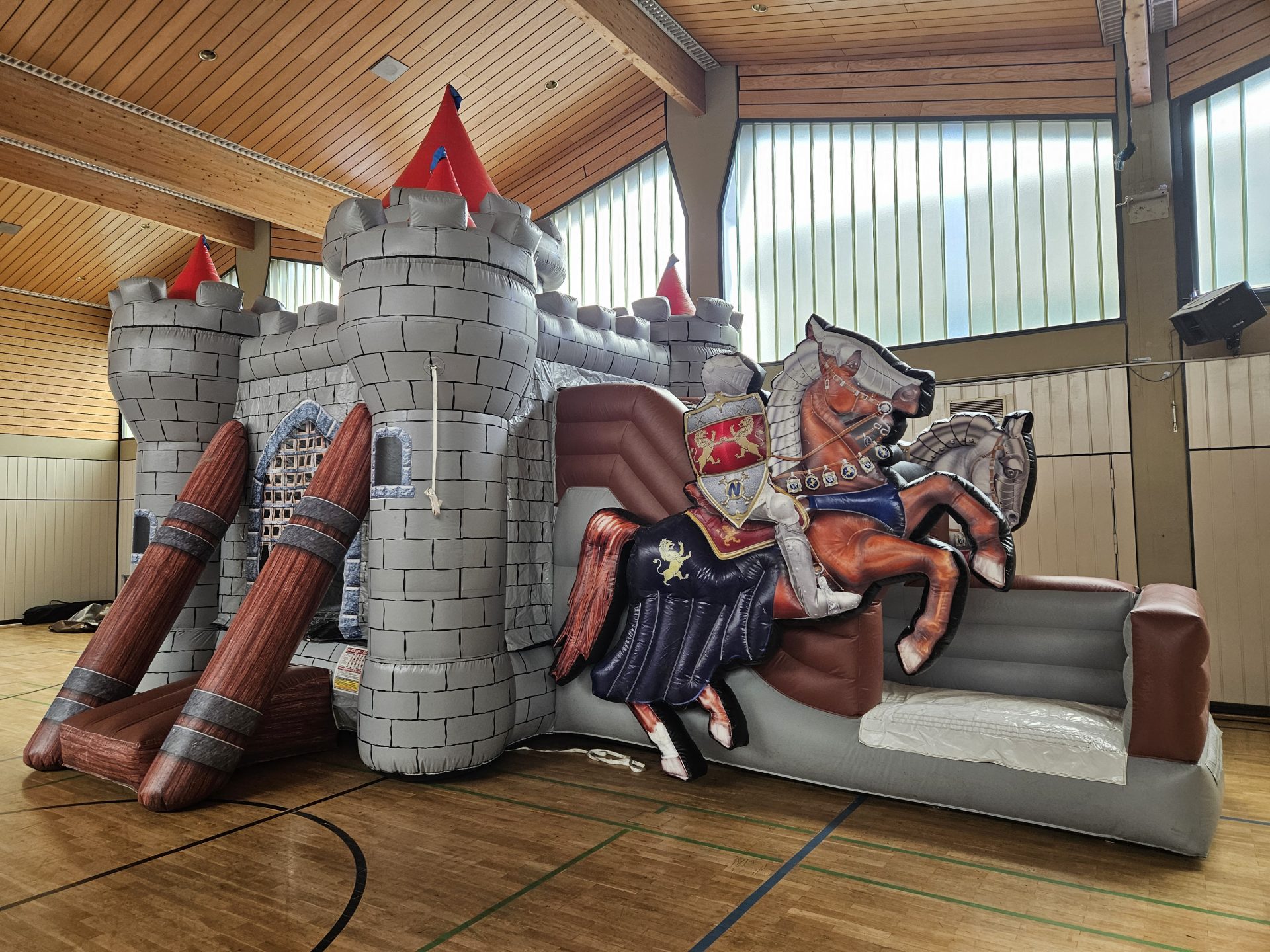 Die XL Ritterburg ist ein echtes Abenteuerparadies für kleine Helden! Mit imposanten Burgtürmen, detailreichen Ritter- und Pferdefiguren sowie einer großen Rutsche bietet sie actiongeladenen Spaß für jedes Event. Im Inneren lädt eine großzügige Hüpffläche mit bunten Spielfeldern zum Toben ein. Perfekt für mittelgroße bis große Veranstaltungen, Kindergeburtstage oder Themenfeste – diese Hüpfburg macht jede Feier zum epischen Ritterabenteuer.