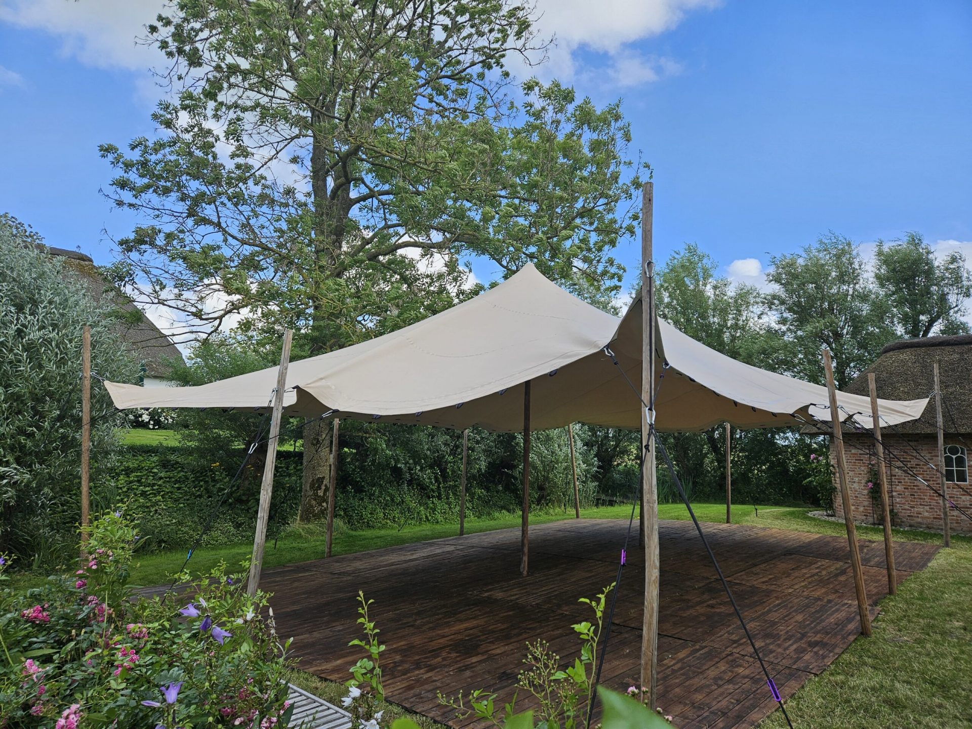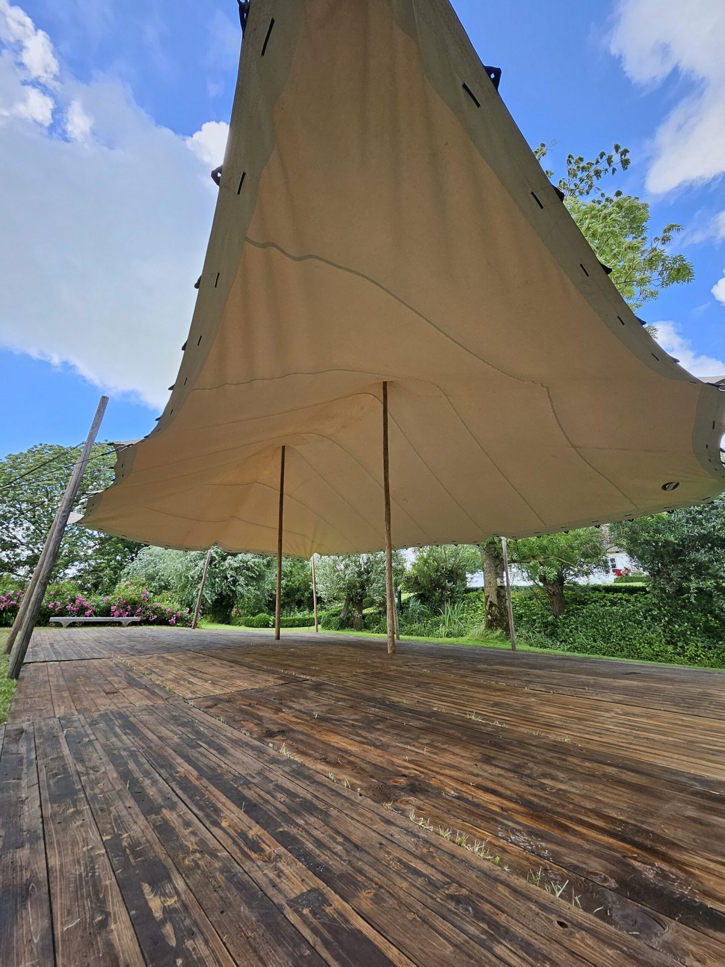 Das Zelt besteht aus einem beidseitig PU-beschichteten Stoff, der sowohl langlebig als auch UV-beständig ist. Die Zeltstangen sind in Holz oder Aluminium erhältlich und bieten zusätzliche Stabilität.